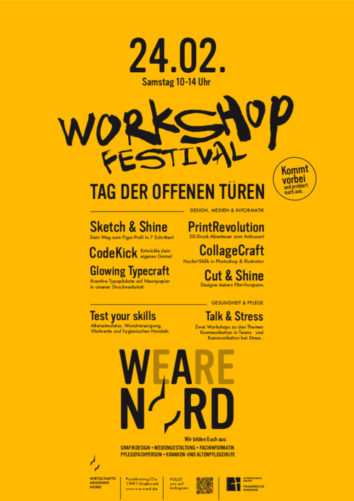 Greifswald kreativstes Ausbildungszentrum öffnet am 24.02.2024 von 10 bis 14 Uhr im Puschkinring seine Türen. Ob Workshop-Festival, informative Vorträge zu den Ausbildungsmöglichkeiten oder Führungen durch die modernen Räumlichkeiten, für Interessierte gibt es einiges zu entdecken. Der Fachbereich Medien und Informatik präsentiert die neuesten Arbeiten seiner Auszubildenden. Schwerpunkte sind Kurzfilme, Fotografien, 3-D-Modulationen, Animationen sowie Corporate-Designs. Kreative Workshops geben Einblicke in die Ausbildungsmöglichkeiten in den Berufsfeldern Mediengestaltung, Fachinformatik und Grafikdesign: „Sketch & Shine“ - zum Figur-Profi in 7 Schritten; „glowing Typecraft“ - Verwandlung historischer Typografie in glänzende Plakate auf Neonpapier; kreative 3D-Druck-Abenteuer zum Anfassen; „CodeKick“ - Erstellung eines eigenen Spiels; „Cut & Shine“ - Erstellung eines eigenen Vorspanns. Der Fachbereich Pflege und Gesundheit bietet die Einblicke in die Berufswelt und Arbeitsbereiche der angehenden Pflegefachpersonen und Kranken- und Altenpflegehilfe. Ein interaktiver Alterssimulator zeigt das Gefühl im Alter von 80 Jahren, um die Herausforderungen und Besonderheiten des Älterwerdens besser nachzuvollziehen. Zudem werden Techniken zur „Wundversorgung“ vermittelt. Der Workshop „Vitalwerte und Blutzucker“ liefert Einblicke in die Messung, Ergebnisse und Interpretation der Werte. Erlernen Sie die Grundlagen hygienischen Handelns oder nützliche Hinweise für Selbst- und Fremdschutz in der Pflege. Erfahren Sie, wie Sie effektiv mit Ihrem Team kommunizieren können. Der Workshop „Kommunikation und Team“ bietet praktische Übungen und Tipps, um die Zusammenarbeit zu verbessern und gemeinsame Ziele zu erreichen. Tauchen in die Welt der stressfreien Kommunikation ein. Lernen Sie Strategien, um in stressigen Situationen effektiv zu kommunizieren und so die Zusammenarbeit im Kollegium zu stärken. Mit dem Tag der offenen Tür informiert die Wirtschaftsakademie Nord zudem über die neu startenden Ausbildungen in 2024: Bereits ab dem 01.03. startet die Ausbildung in der Alten- und Krankenpflegehilfe.