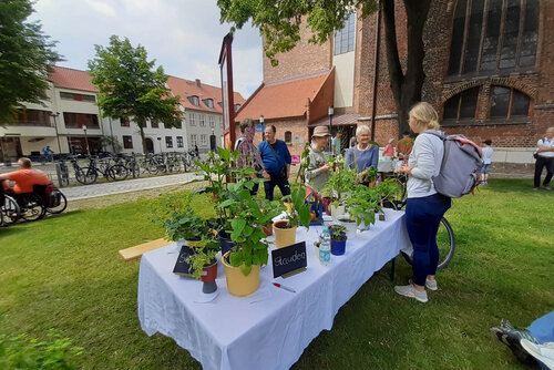 Schon der Auftakt war fulminant: Gleichzeitig hielten das Theater Vorpommern – in prächtigen Romeo-und-Julia-Kostümen – sowie die Folkloregrupp „Ina“ aus Greifswalds Partnerstadt Goleniów Einzug. Nebenbei übte der Kinderchor auf einer Picknickdecke noch mal für seinen Auftritt. Letzte Vorbereitungen an den Info-Ständen wurden getroffen und erste Kuchenstücke verzehrt.